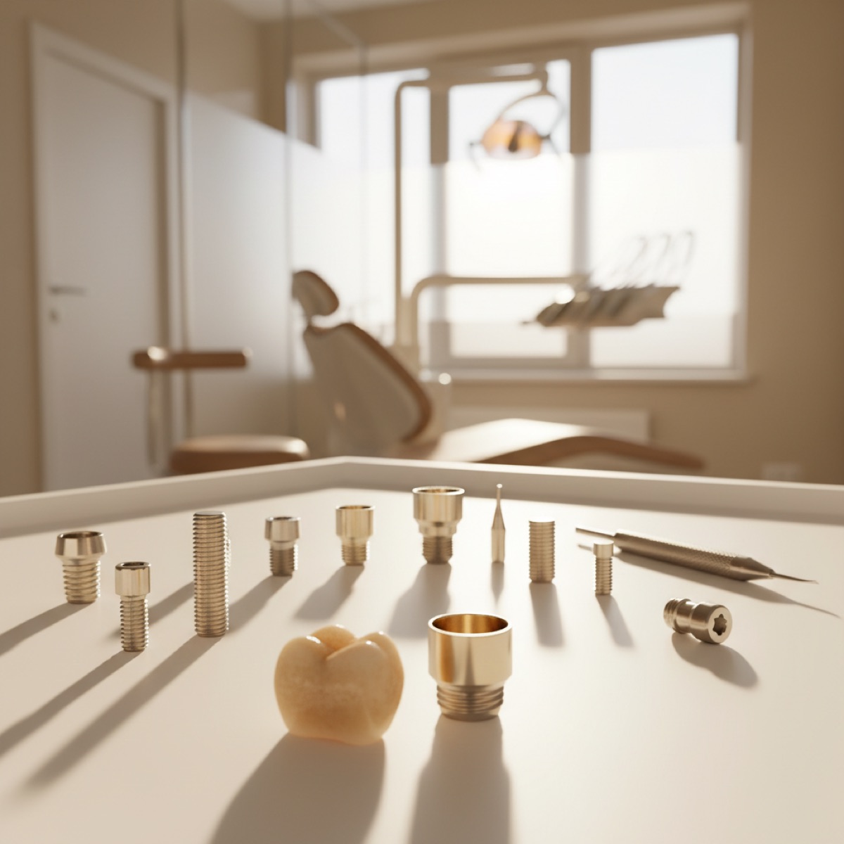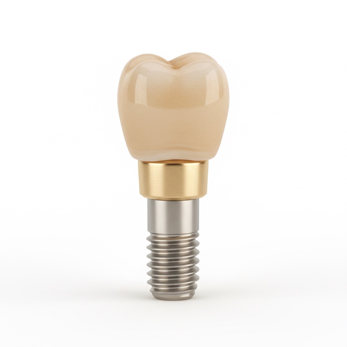 Современный дентальный имплантат — это небольшой титановый винт, который прочно устанавливается в кость челюсти, замещая корень зуба. Во внутреннюю часть импланта вставляется абатмент — соединительный элемент, на который крепится несъёмная коронка, мостовидный протез или специальный гибридный протез.