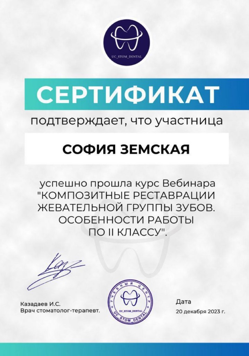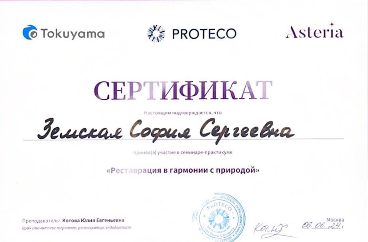 “София Сергеевна — настоящий профессионал своего дела. Восстановила дочке откол зуба с помощью художественной реставрации — результат идеальный, не отл...”