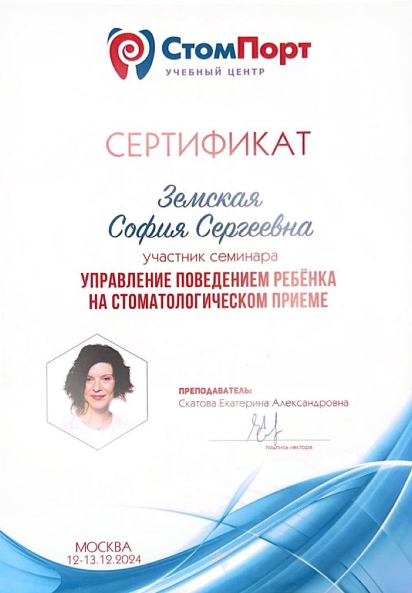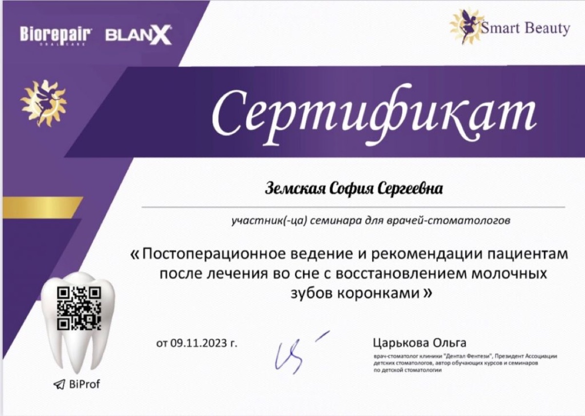 Сертификат: Постоперационное ведение после лечения во сне с восстановлением молочных зубов